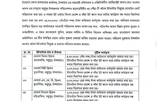 পরিবেশ অধিদপ্তর কতৃক টাঙ্গাইল জেলার মধুপুর উপজেলায় ইটভাটায় অভিযান